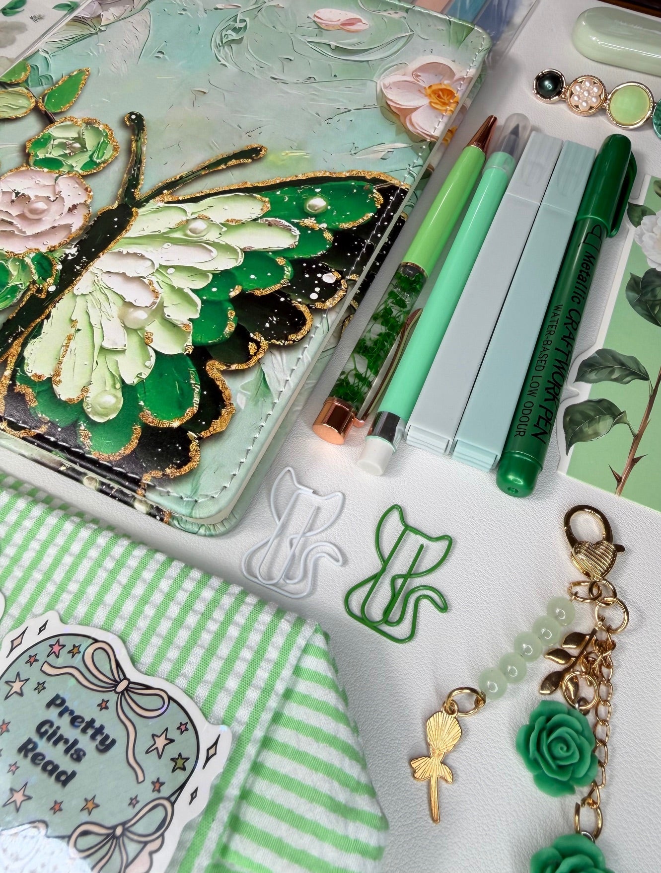 Featuring a beautifully textured notebook, matching pens, sticky notes, washi tape, bookmarks, clips, a pencil case, and elegant accessories in soothing green tones. Perfect for journaling, planning, studying, or gifting. A dreamy, nature-inspired set for every stationery lover!